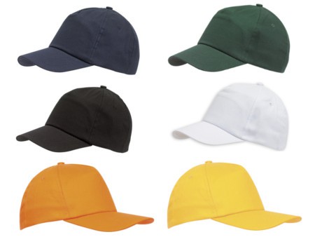 Algodón. 5 paneles con parte frontal reforzada, 2 ojales bordados, botón y cierre ajustable de velcro.