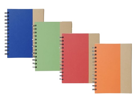 Libretas Eco, 18 x 13.5 x 1 cm. Cuaderno de cartón con espiral. Dos post it rectangulares (grande y mediano), cinco post it señaladores de diferente color y bolígrafo.